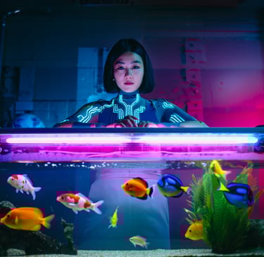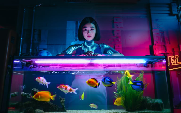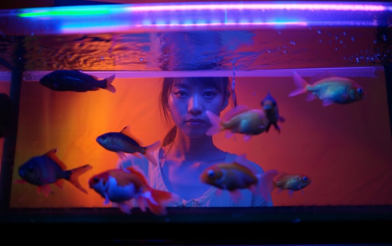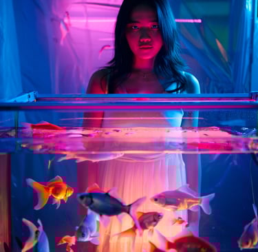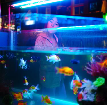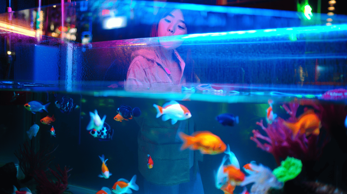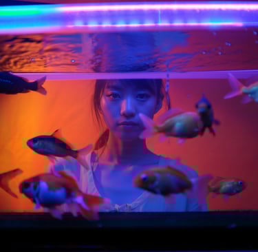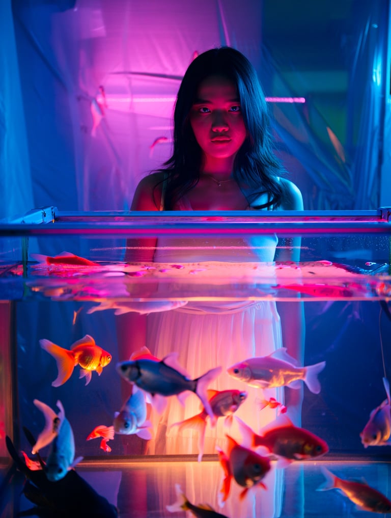 " Plan néon d'un femme asiatique, vue au travers d'un aquarium rempli de poissons asiatiques, éclairée par des néons."