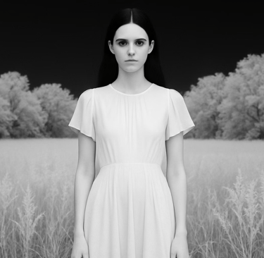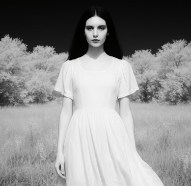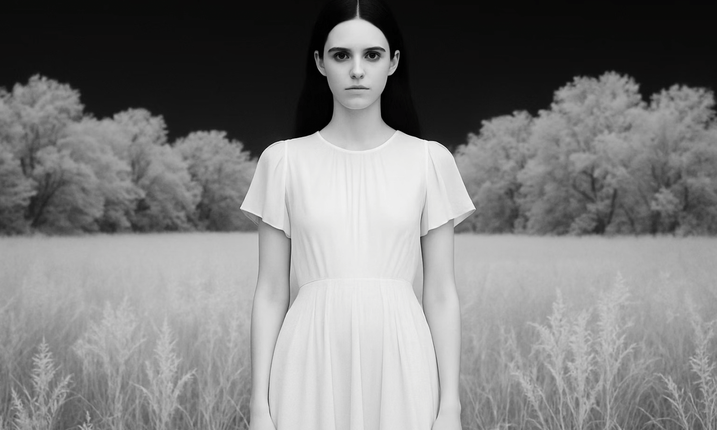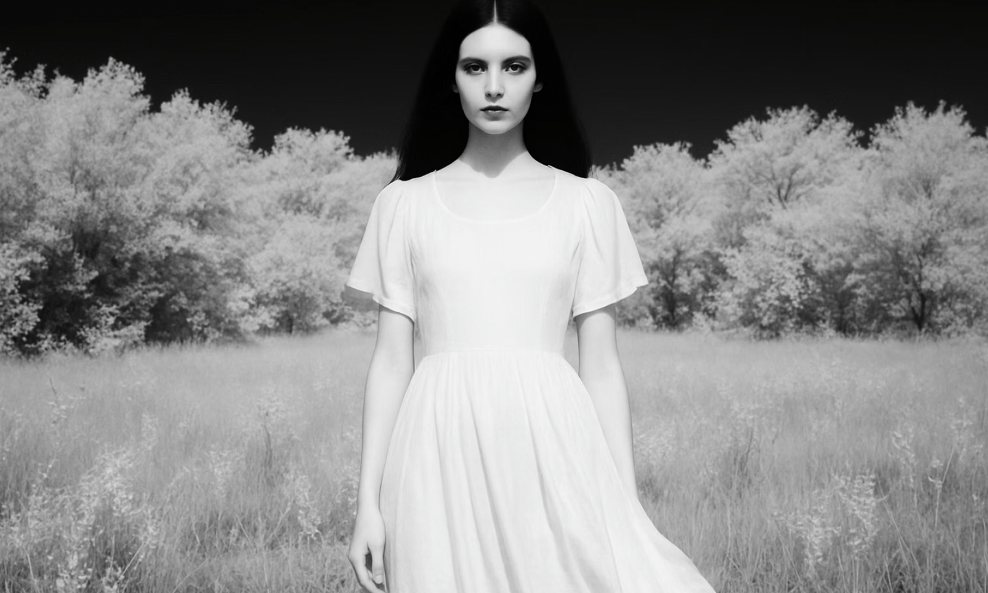 " Top model femme en robe fluide blanche, debout au milieu d9un champ immobile, portrait plan moyen en lumière infrarouge, peau laiteuse et sans texture visible, cheveux foncés absorbant la lumière, robe et végétation éclatantes presque blanches (effet Wood), ambiance irréelle et silencieuse, style mode expérimental et poétique, arrière-plan de feuillages pâles et ciel noir profond, composition frontale centrée, regard fixe et impassible, format vertical éditorial, rendu IR noir et blanc très contrasté, esthétique entre élégance et étrangeté. "