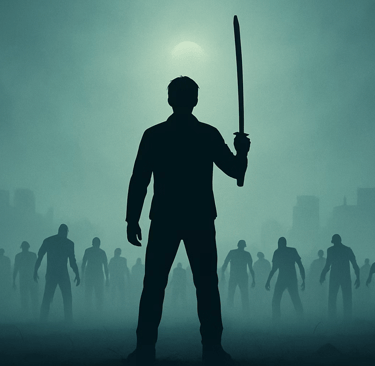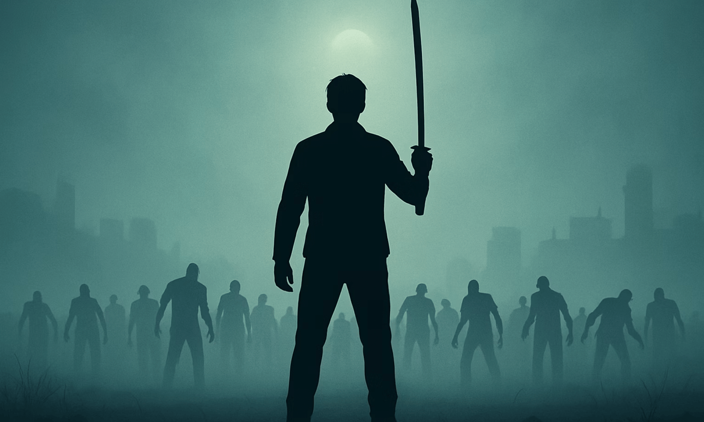 "Homme solitaire debout de dos, tenant un katana levé face à une horde de zombies indistincts à l9horizon, portrait plein pied en contre-jour, lumière froide et diffuse émanant d'un ciel bleu-verdâtre brumeux, ambiance tendue et irréelle, style silhouette graphique, aucun détail visible sur le visage ni l9arme, contours nets du corps et du katana, silhouettes des zombies à demi effacées dans la brume, décor post-apocalyptique suggéré en fond flou, composition verticale dramatique."