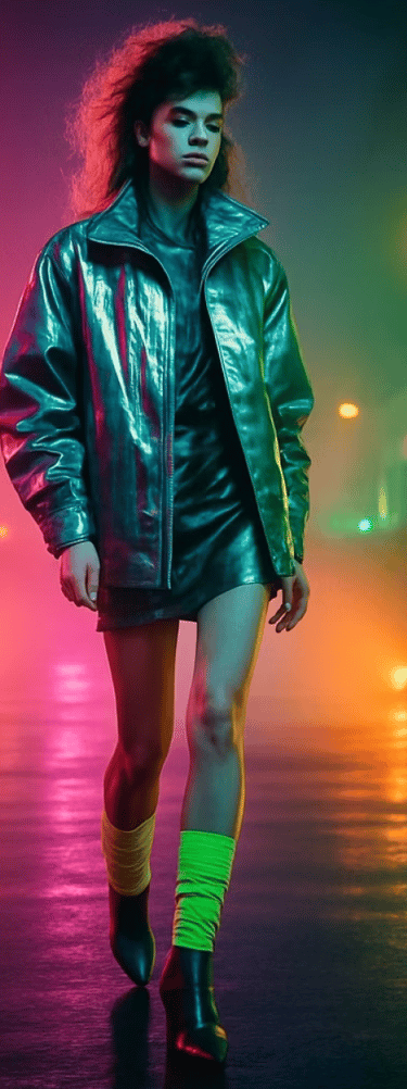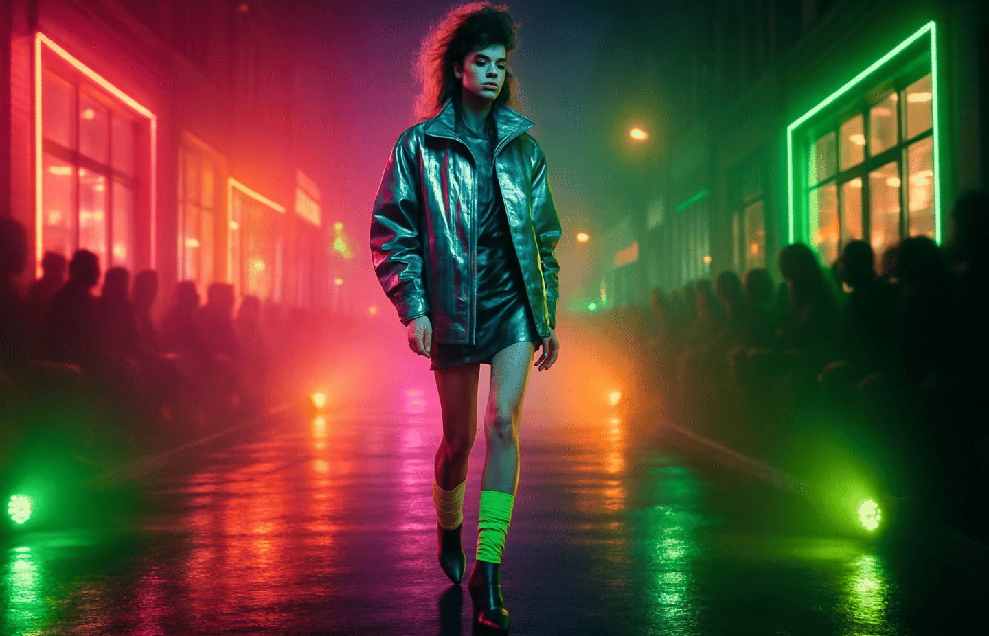 " Femme mannequin défilant de nuit sur une avenue urbaine éclairée par des néons rose orangé et vert fluorescent, cadrage plan large légèrement en contre-plongée, tenue futuriste rétro inspirée des années 80 (veste oversize métallisée, jambières fluo, talons géométriques), ambiance stylisée entre show de mode et univers synthwave, décor urbain avec vitrines lumineuses, reflets sur l9asphalte mouillé, silhouettes floues du public de chaque côté, projecteurs colorés avec gélatines vertes et ambre sur le podium, brume artificielle diffusant la lumière, composition dynamique en format horizontal 16/9, rendu cinématographique vibrant et électro-rétro."