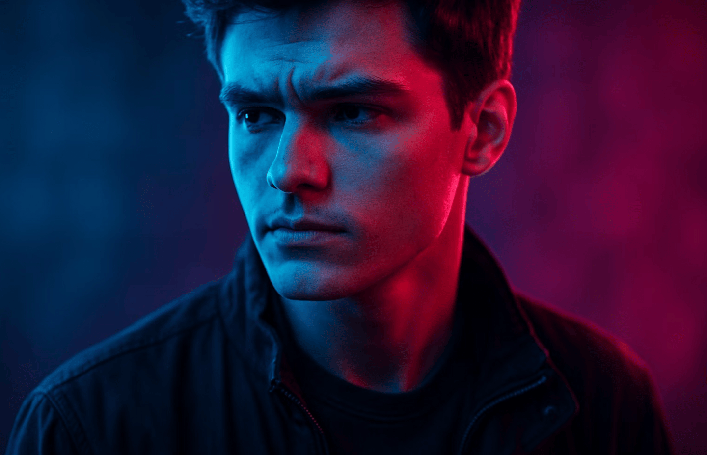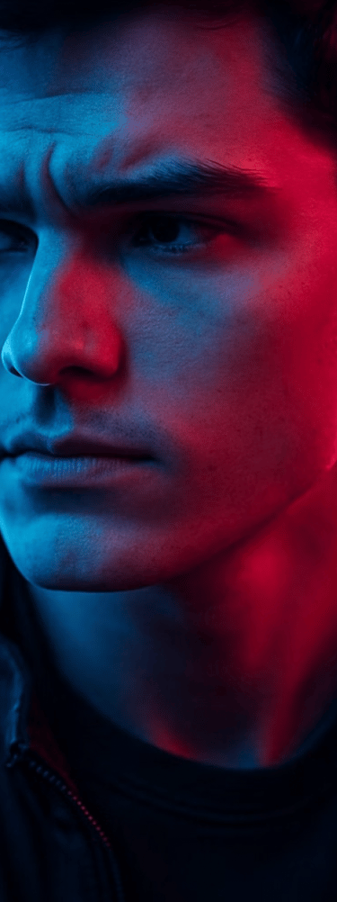 " Jeune homme en veste sombre, portrait plan rapproché en studio, éclairé par deux sources de lumière croisées avec gélatines colorées (bleu électrique à gauche, rose néon à droite), ambiance nocturne stylisée inspirée du cinéma néon, fond studio flou teinté par les reflets colorés, regard intense hors champ, peau légèrement texturée par la lumière, composition serrée au format cinémascope vertical, style visuel dramatique et contemporain, teintes saturées, atmosphère entre tension et contemplation."