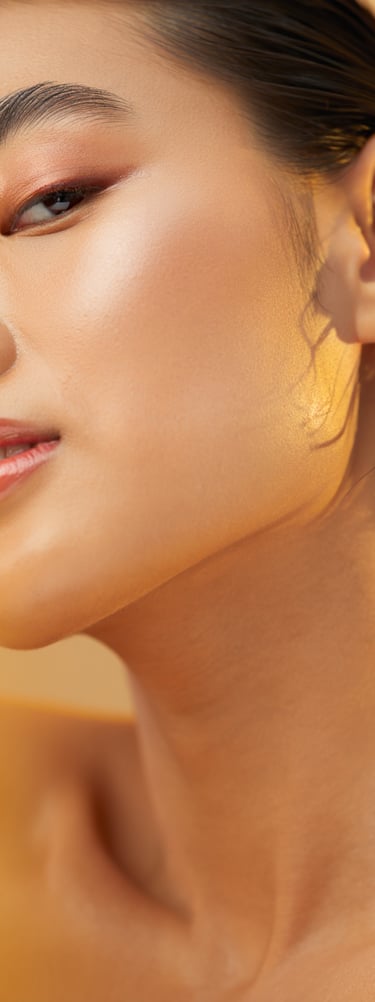 Prompt complet : " Jeune femme à la peau éclatante, vue de profil légèrement inclinée vers la lumière, regard doux vers l’horizon, lumière dorée chaude venant de la gauche avec reflets subtils dans les cheveux, ambiance apaisante et solaire, style publicité cosmétique haut de gamme, fond dégradé beige sable et or clair, maquillage nude lumineux, composition fluide et élégante, qualité ultra HD."