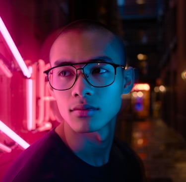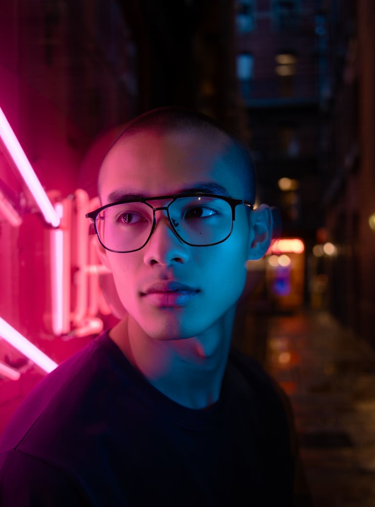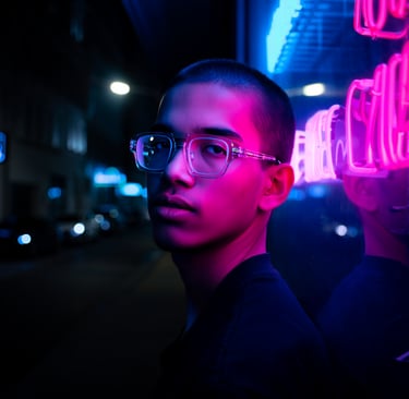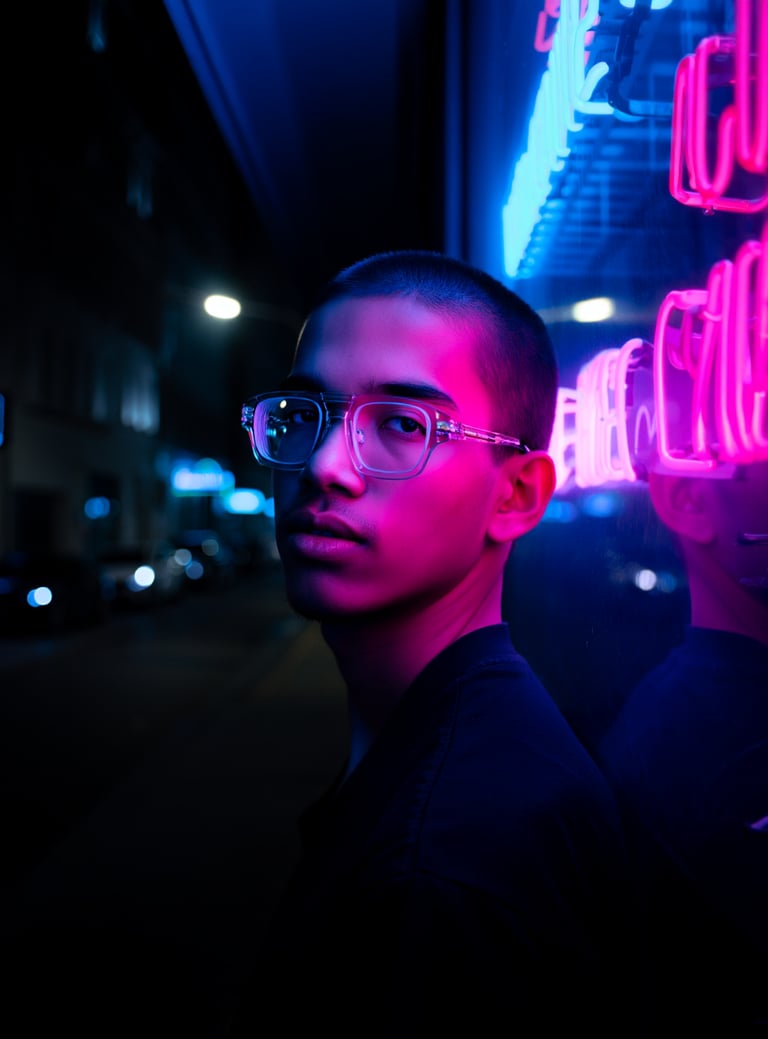 " Jeune homme rasé avec lunettes, portrait 3/4, éclairage néon croisé (rose et bleu), ambiance cyberpunk et urbaine, style portrait nuit futuriste, néons et ruelle sombre en arrière-plan, reflets sur lunettes, cadrage latéral, 4K. "