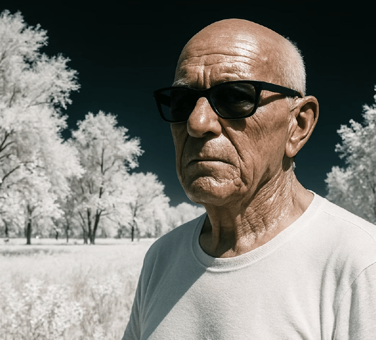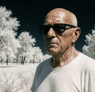 "Vieil homme dans un champ d'arbres blancs, portrait demi-corps, lumière solaire haute, ambiance étrange et inversée, style infrarouge artistique, ciel noir, végétation blanche, peau texturée brillante, composition décentrée, format numérique 4:3."