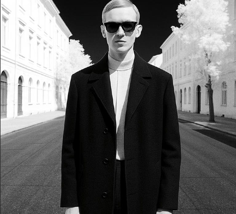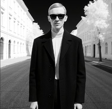 " Homme en manteau long sombre et lunettes noires, debout seul au milieu d'une rue déserte, portrait plan large en lumière infrarouge, buildings aux façades blanches éclatantes,iel noir profond, bitume mat texturé, feuillages urbains lumineux presque translucides, peau très pâle et sans contraste, ambiance silencieuse et irréelle, style mode urbain expérimental, posture droite et distante, regard vers l'horizon, composition graphique en ligne de fuite, rendu IR noir et blanc très contrasté, esthétique entre science-fiction, solitude et élégance éditoriale. "