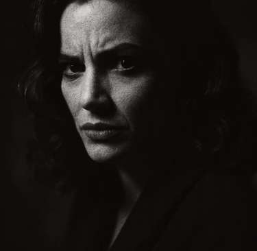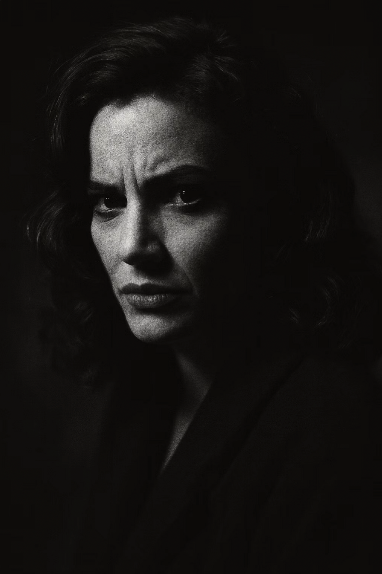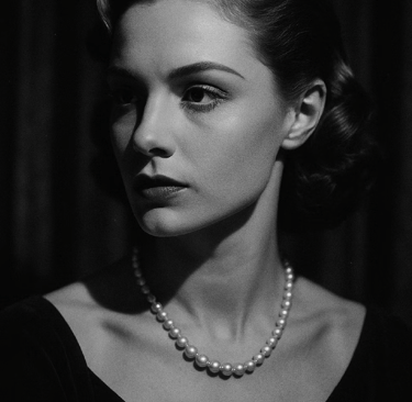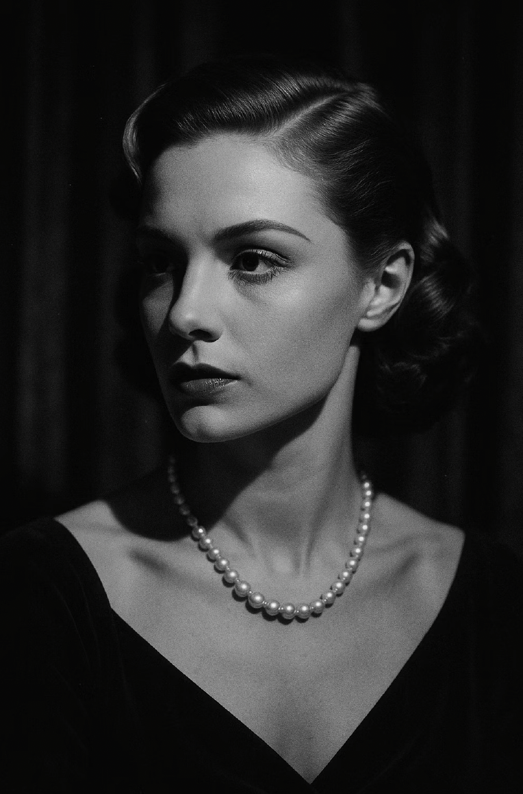 "Femme élégante avec coiffure années 40 et collier de perles, gros plan, éclairage bas avec forts contrastes, ambiance cinéma noir hollywoodien, style photo argentique N&B, rideau de velours flou en arrière-plan, grain visible, composition règle des tiers."
