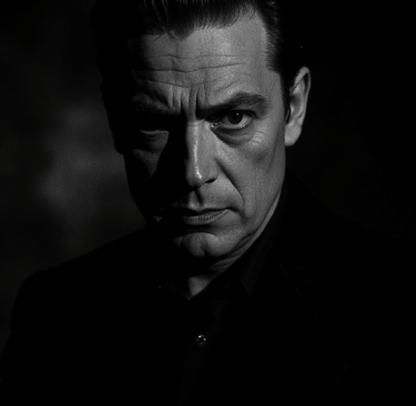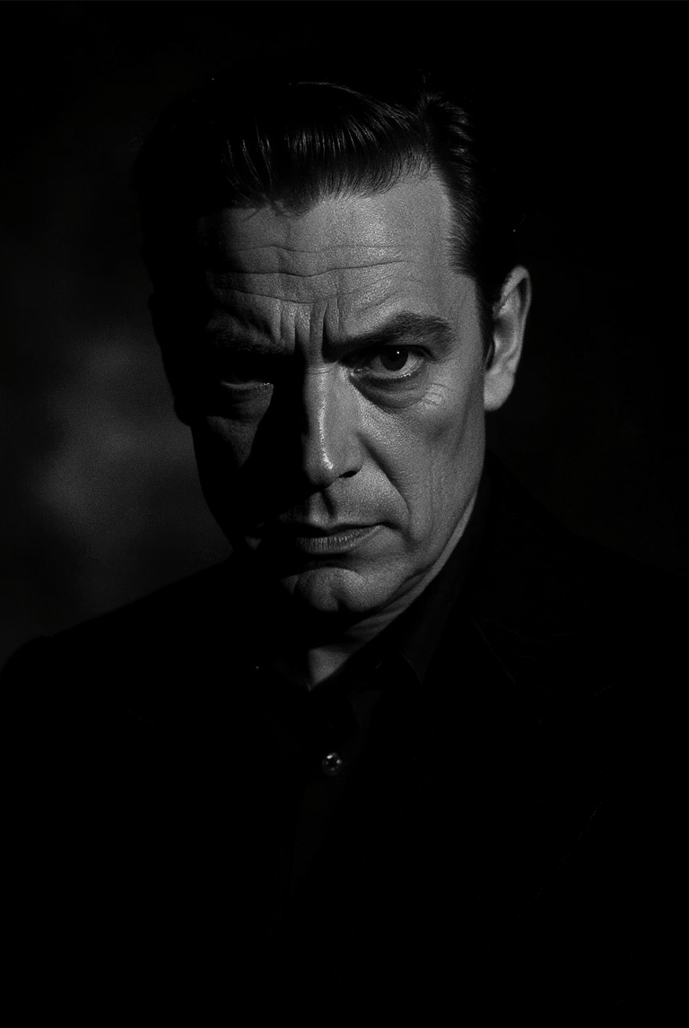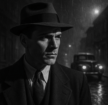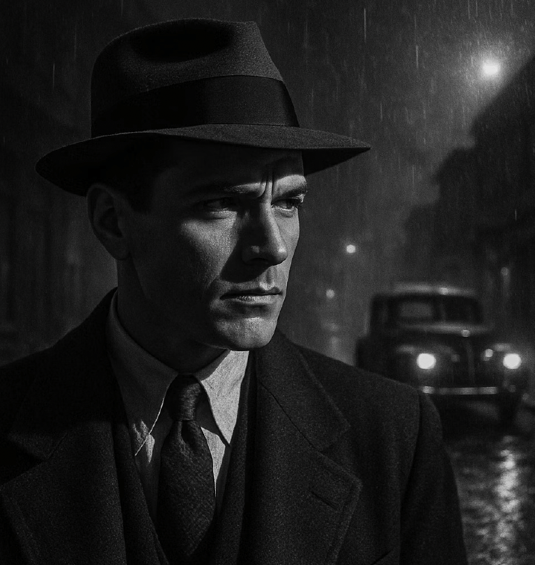 "Homme élégant avec coiffure années 40 et chapeau feutre, gros plan, éclairage bas avec forts contrastes, ambiance cinéma noir hollywoodien, style photo argentique N&B, rue pluvieuse avec vieille voiture arrière-plan, grain visible, composition règle des tiers."