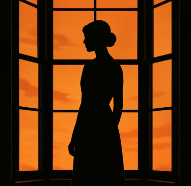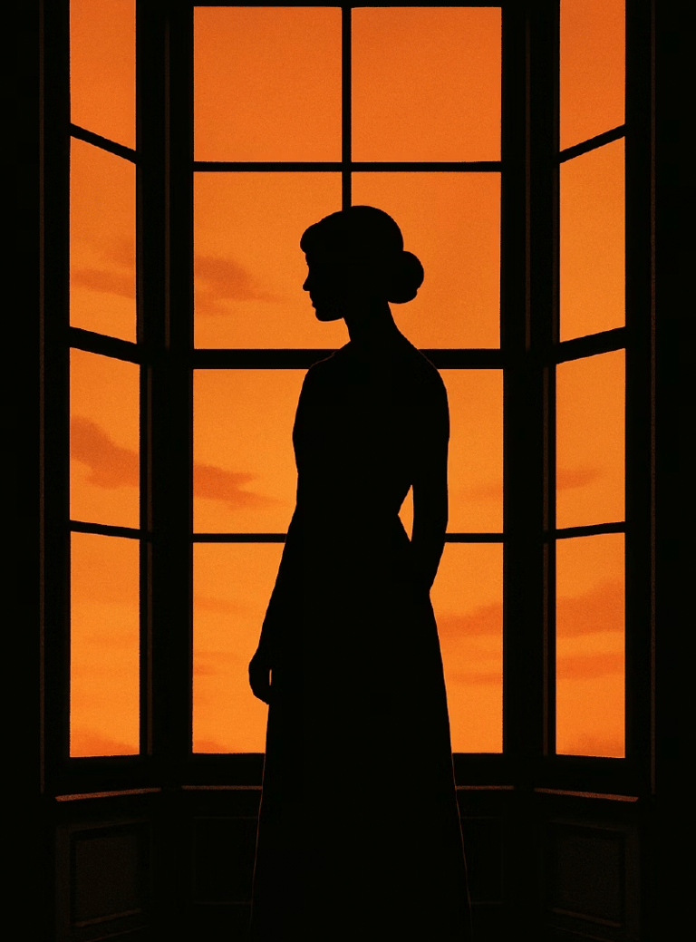 "Femme debout devant une baie vitrée, portrait plein pied, lumière de coucher de soleil en contre-jour, ambiance poétique et silencieuse, style silhouette graphique, fond ciel orangé, contours nets, aucun détail visible sur le visage, composition verticale."