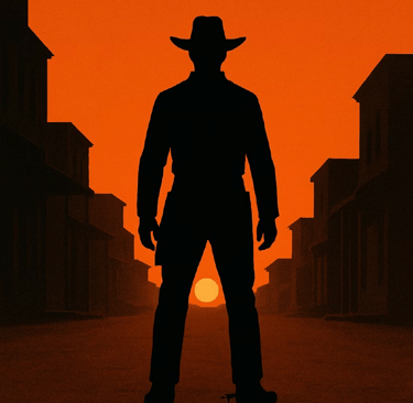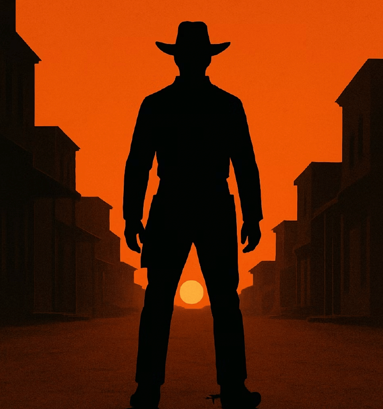 " Cowboy solitaire debout au centre d'une rue poussiéreuse d'une ville du Far West, portrait plein pied en contre-jour, lumière de coucher de soleil bas sur l'horizon créant une silhouette découpée nette, ambiance silencieuse et cinématographique, style graphique minimaliste, fond orangé brûlant avec quelques bâtiments en ombre, aucun détail visible sur le visage ni les vêtements, contours nets du chapeau et des éperons. "