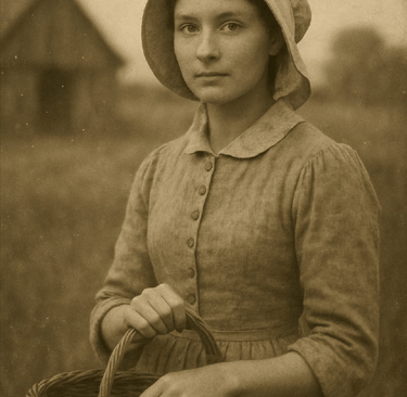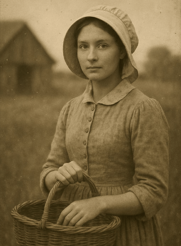 "Fermière avec bonnet et panier, portrait demi-longueur, lumière plate douce, ambiance nostalgique et rurale, style photo ancienne sépia, grange floue et champ en arrière-plan, effets de poussière et flou, composition décentrée."