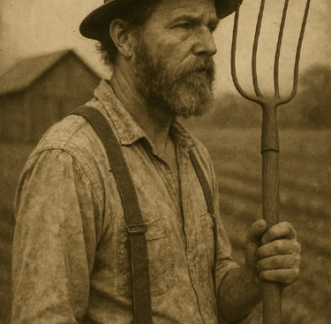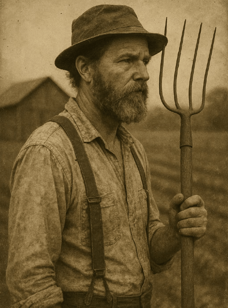 "Fermier barbu en chemise usée et bretelles, tenant une fourche à la main, portrait demi-longueur légèrement de profil, lumière plate douce rappelant les vieux appareils argentiques, ambiance rurale et nostalgique, style photo ancienne en tons sépia, arrière-plan flou avec grange en bois et champs labourés, textures poussiéreuses, flou naturel sur les bords, composition décentrée vers la gauche, grain apparent, format vertical."