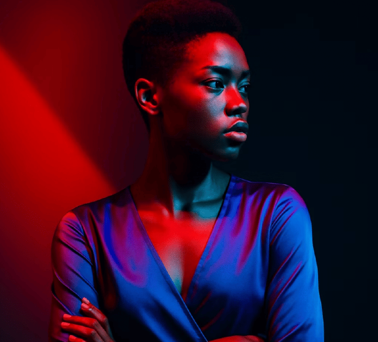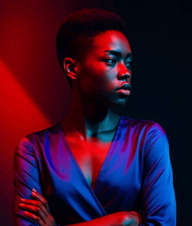 " Jeune femme afro avec coupe courte, portrait de 3/4, lumière croisée avec gélatine rouge et bleue, ambiance électrique et intense, style studio coloré mode, fond noir lissé, fort contraste entre ombre et lumière, composition dynamique en triangle, format carré."