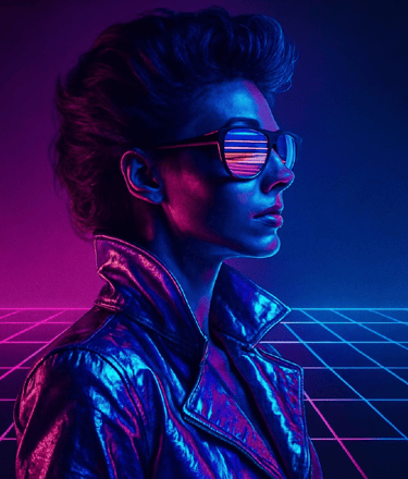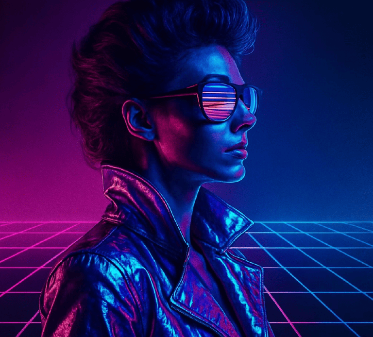 " Femme en combinaison métallisée inspirée des années 80, de profil en studio, éclairée par deux gélatines colorées saturées (violet profond à gauche, cyan néon à droite), ambiance rétro-futuriste synthwave, fond sombre avec dégradé rose/bleu et grille vectorielle simulée en lumière, lunettes miroir réfléchissant les couleurs du décor, posture fière et détachée, style graphique inspiré de l'univers arcade et VHS, composition géométrique au format carré, ambiance entre nostalgie rétro et anticipation digitale."