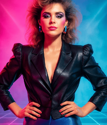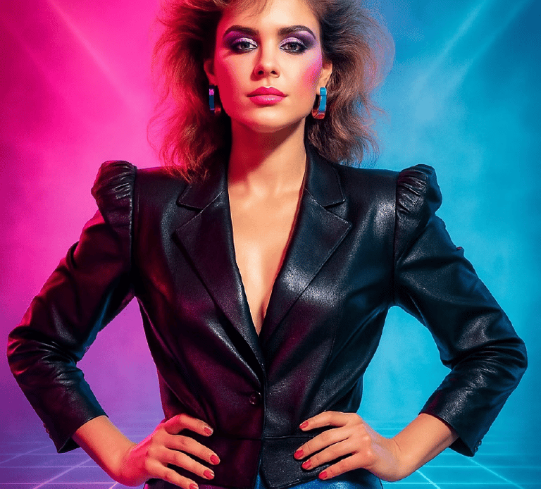 " Femme mannequin blanche debout en pleine lumière, pose assurée, habillée d'un ensemble rétro années 80 (épaulettes, matières brillantes, leggings irisés), portrait plan moyen en studio, éclairée par deux gélatines intenses (rose fuchsia à gauche, bleu turquoise à droite), fond graphique stylisé évoquant une piste de danse avec grille laser au sol et reflets de lumière, brume douce pour diffusion, ambiance synthwave entre mode et club électro, cheveux volumineux coiffés façon 80s, maquillage coloré et contrasté, composition frontale avec symétrie légèrement brisée, format vertical éditorial."