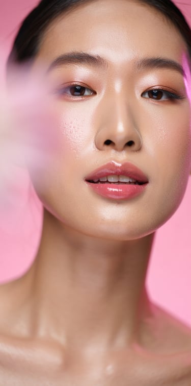 " Jeune femme à la peau parfaite, regard doux vers l’objectif, portrait très rapproché, lumière diffuse ultra douce, fond totalement blanc, ambiance éclatante et lumineuse, style publicitaire cosmétique, maquillage discret avec lèvres brillantes et cils longs, tons pastels, détails peau ultra HD, reflets subtils dans les yeux, composition symétrique, contraste minimal, format vertical."